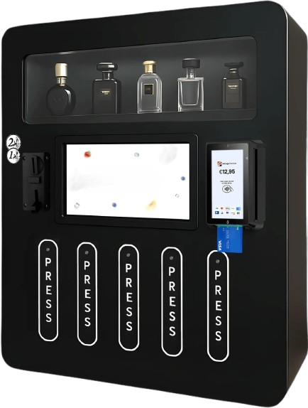 Unser Parfümautomat verbindet modernes Design mit exklusiver Produktpräsentation – ideal für Friseure, Lounges, Clubs oder Eventlocations. Durch sein auffälliges Erscheinungsbild zieht er sofort Aufmerksamkeit auf sich und verwandelt jeden Standort in ein besonderes Erlebnis.